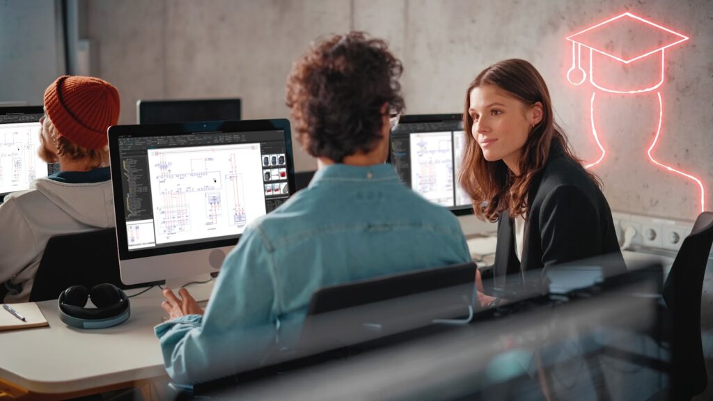 A partire dal layout del PLC S7 1200, le studentesse e gli studenti realizzano schemi elettrici multifilari utilizzando ePlan Education 2025. L’attività comprende la configurazione dei moduli digitali, l’assegnazione degli indirizzi e la definizione della rete Profinet, oltre alla creazione delle tavole di ingombro per la disposizione dei componenti nel quadro.